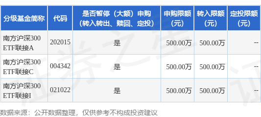 证券之星消息,10月15日南方基金管理股份有限公司发布《南方沪深300交易型开放式指数证券投资基金联接基金限制大额申购、定投和转换转入业务的公告》。公告中提示,为保护基金份额持有人的利益,自2024年10月15日起南方沪深300交易型开放式指数证券投资基金联接基金限制大额申购、定投和转换转入业务,申购、转换转入上限金额为500.0万元,下属分级基金调整明细如下: