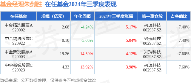 中金新锐股票A现任基金经理为朱剑胜。其中在任基金经理朱剑胜已从业2年又239天,2022年3月2日正式接手管理中金新锐股票A,任职期间累计回报为-4.91%。目前还管理着4只基金产品(包括A类和C类),其中本季度表现最佳的基金为中金精选股票A(920002),季度净值涨幅为5.17%。
