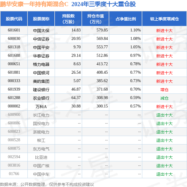 从基金规模来看,鹏华安康一年持有期混合C基金2024年三季度公布的基金规模为0.3亿元,较上一期规模3314.38万元变化了-356.45万元,环比变化了-10.75%。该基金最新一期资产配置为:股票占净值比18.94%,债券占净值比85.7%,现金占净值比16.09%。从基金持仓来看,该基金当季前十大股票仓位达8.34%,第一大重仓股为中国太保(601601),持仓占比为1.1%。