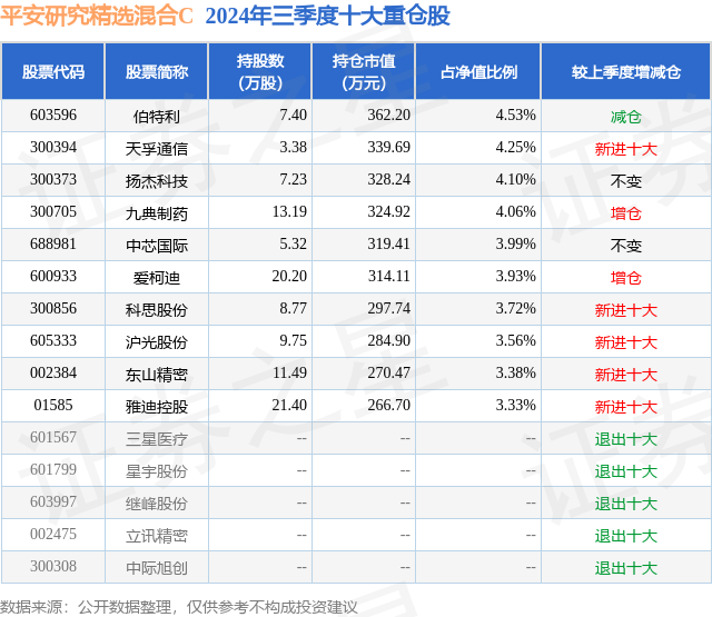 从基金规模来看,平安研究精选混合C基金2024年三季度公布的基金规模为0.3亿元,较上一期规模2646.18万元变化了304.69万元,环比变化了11.51%。该基金最新一期资产配置为:股票占净值比86.48%,无债券类资产,现金占净值比20.12%。从基金持仓来看,该基金当季前十大股票仓位达38.85%,第一大重仓股为伯特利(603596),持仓占比为4.53%。