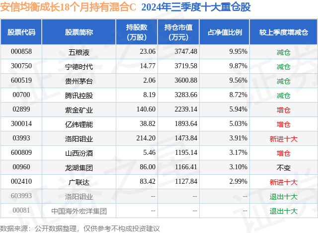 从基金规模来看,安信均衡成长18个月持有混合C基金2024年三季度公布的基金规模为0.16亿元,较上一期规模1447.53万元变化了189.99万元,环比变化了13.12%。该基金最新一期资产配置为:股票占净值比91.38%,债券占净值比4.73%,现金占净值比2.91%。从基金持仓来看,该基金当季前十大股票仓位达62.24%,第一大重仓股为五粮液(000858),持仓占比为9.95%。