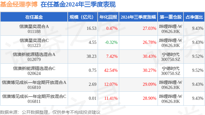 信澳新能源精选混合A现任基金经理为李博。其中在任基金经理李博已从业3年又155天,2021年5月25日正式接手管理信澳新能源精选混合A,任职期间累计回报为27.74%。目前还管理着6只基金产品(包括A类和C类),其中本季度表现最佳的基金为信澳新能源精选混合A(012079),季度净值涨幅为30.43%。
