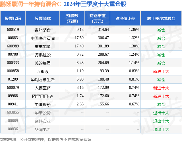 从基金规模来看,鹏扬景润一年持有混合C基金2024年三季度公布的基金规模为0.07亿元,较上一期规模844.68万元变化了-154.43万元,环比变化了-18.28%。该基金最新一期资产配置为:股票占净值比17.82%,债券占净值比87.93%,现金占净值比3.66%。从基金持仓来看,该基金当季前十大股票仓位达10.15%,第一大重仓股为贵州茅台(600519),持仓占比为1.36%。