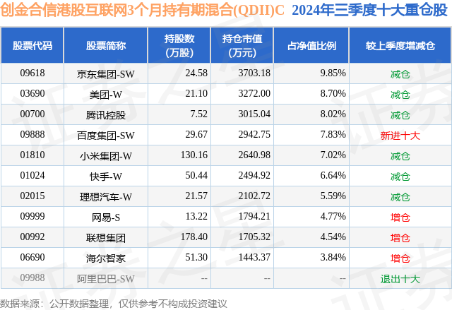 从基金规模来看,创金合信港股互联网3个月持有期混合(QDII)C基金2024年三季度公布的基金规模为1.09亿元,较上一期规模8671.84万元变化了2262.82万元,环比变化了26.09%。该基金最新一期资产配置为:股票占净值比89.38%,无债券类资产,现金占净值比6.08%。从基金持仓来看,该基金当季前十大股票仓位达66.8%,第一大重仓股为京东集团-SW(09618),持仓占比为9.85%。