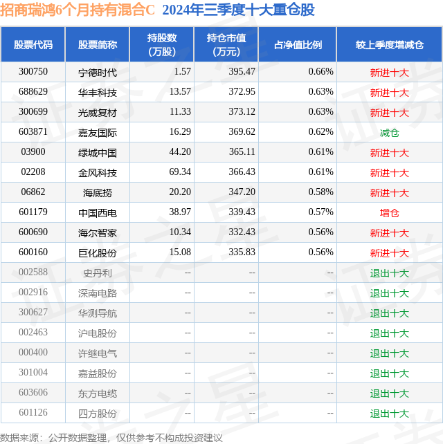 从基金规模来看,招商瑞鸿6个月持有混合C基金2024年三季度公布的基金规模为0.62亿元,较上一期规模6463.35万元变化了-235.17万元,环比变化了-3.64%。该基金最新一期资产配置为:股票占净值比20.57%,债券占净值比72.88%,现金占净值比1.66%。从基金持仓来看,该基金当季前十大股票仓位达6.03%,第一大重仓股为宁德时代(300750),持仓占比为0.66%。