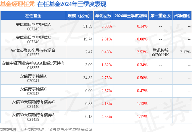 从基金规模来看,安信宏盈18个月持有混合基金2024年三季度公布的基金规模为2.47亿元,较上一期规模3.3亿元变化了-8324.18万元,环比变化了-25.19%。该基金最新一期资产配置为:股票占净值比10.58%,债券占净值比112.23%,现金占净值比3.37%。从基金持仓来看,该基金当季前十大股票仓位达8.39%,第一大重仓股为腾讯控股(00700),持仓占比为2.12%。