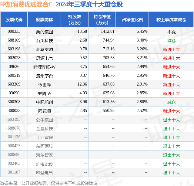 从基金规模来看,中加消费优选混合C基金2024年三季度公布的基金规模为0.21亿元,较上一期规模2483.83万元变化了-394.47万元,环比变化了-15.88%。该基金最新一期资产配置为:股票占净值比91.3%,债券占净值比0.65%,现金占净值比6.79%。从基金持仓来看,该基金当季前十大股票仓位达33.34%,第一大重仓股为美的集团(000333),持仓占比为6.45%。