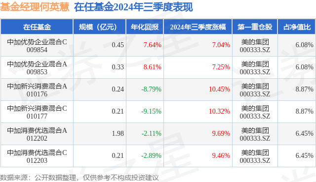 中加消费优选混合C现任基金经理为何英慧。其中在任基金经理何英慧已从业1年又294天,2023年6月30日正式接手管理中加消费优选混合C,任职期间累计回报为-16.16%。目前还管理着6只基金产品(包括A类和C类),其中本季度表现最佳的基金为中加新兴消费混合A(010176),季度净值涨幅为10.45%。