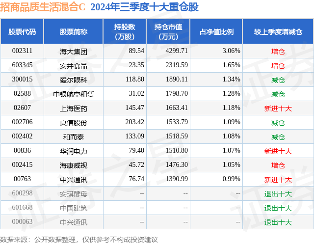 从基金规模来看,招商品质生活混合C基金2024年三季度公布的基金规模为4.19亿元,较上一期规模3.96亿元变化了2293.28万元,环比变化了5.8%。该基金最新一期资产配置为:股票占净值比73.0%,无债券类资产,现金占净值比13.52%。从基金持仓来看,该基金当季前十大股票仓位达13.79%,第一大重仓股为海大集团(002311),持仓占比为3.06%。