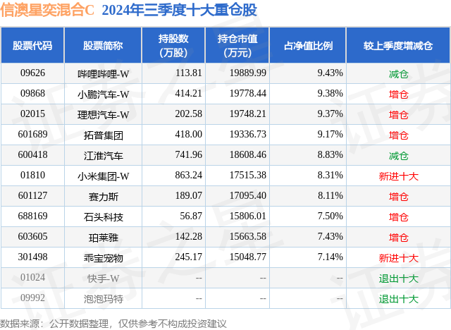 从基金规模来看,信澳星奕混合C基金2024年三季度公布的基金规模为4.55亿元,较上一期规模3.7亿元变化了8525.23万元,环比变化了23.07%。该基金最新一期资产配置为:股票占净值比91.53%,无债券类资产,现金占净值比6.19%。从基金持仓来看,该基金当季前十大股票仓位达84.67%,第一大重仓股为哔哩哔哩-W(09626),持仓占比为9.43%。