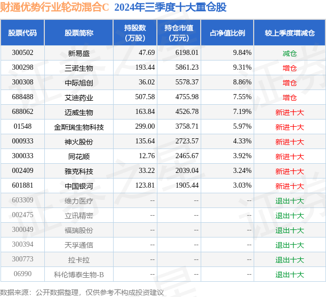 从基金规模来看,财通优势行业轮动混合C基金2024年三季度公布的基金规模为0.22亿元,较上一期规模2097.12万元变化了147.29万元,环比变化了7.02%。该基金最新一期资产配置为:股票占净值比91.63%,债券占净值比0.4%,现金占净值比5.92%。从基金持仓来看,该基金当季前十大股票仓位达63.24%,第一大重仓股为新易盛(300502),持仓占比为9.84%。