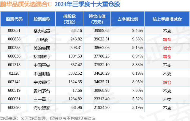 从基金规模来看,鹏华品质优选混合C基金2024年三季度公布的基金规模为6.83亿元,较上一期规模4.49亿元变化了2.33亿元,环比变化了51.98%。该基金最新一期资产配置为:股票占净值比93.41%,债券占净值比2.38%,现金占净值比4.46%。从基金持仓来看,该基金当季前十大股票仓位达80.06%,第一大重仓股为格力电器(000651),持仓占比为9.46%。