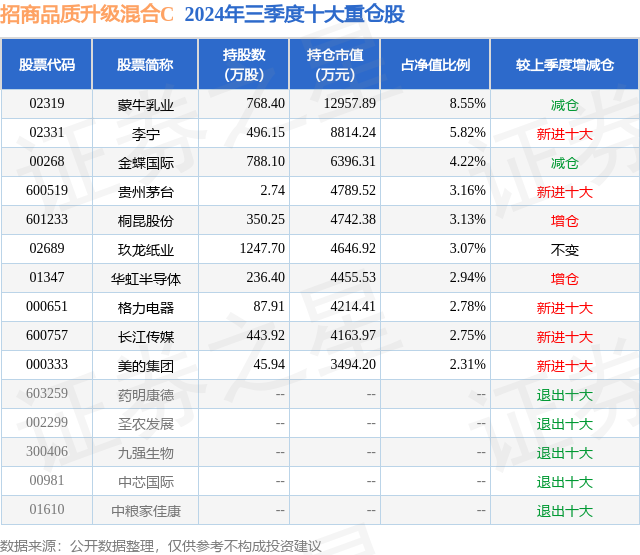 从基金规模来看,招商品质升级混合C基金2024年三季度公布的基金规模为1.6亿元,较上一期规模1.44亿元变化了1588.03万元,环比变化了11.0%。该基金最新一期资产配置为:股票占净值比88.94%,无债券类资产,现金占净值比8.2%。从基金持仓来看,该基金当季前十大股票仓位达38.73%,第一大重仓股为蒙牛乳业(02319),持仓占比为8.55%。