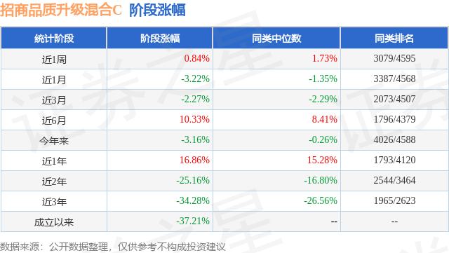 从业绩表现来看,招商品质升级混合C基金过去一年净值涨幅为1.22%,在同类基金中排名2738/3979,同类基金过去一年净值涨幅中位数为5.4%。而基金过去一年的最大回撤为-26.44%,成立以来的最大回撤为-55.26%。