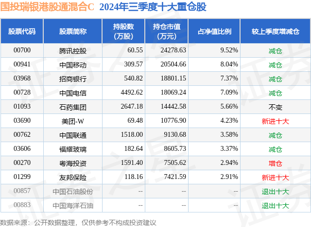 证券之星消息,日前国投瑞银港股通混合C基金公布三季报,2024年三季度最新规模7.93亿元,季度净值涨幅为9.63%。