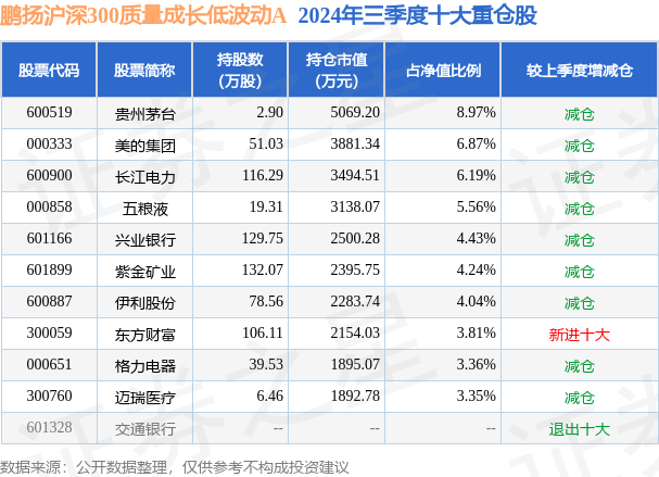 从基金规模来看,鹏扬沪深300质量成长低波动A基金2024年三季度公布的基金规模为1.95亿元,较上一期规模1.61亿元变化了3406.63万元,环比变化了21.22%。该基金最新一期资产配置为:股票占净值比93.56%,债券占净值比5.41%,现金占净值比0.34%。从基金持仓来看,该基金当季前十大股票仓位达50.82%,第一大重仓股为贵州茅台(600519),持仓占比为8.97%。