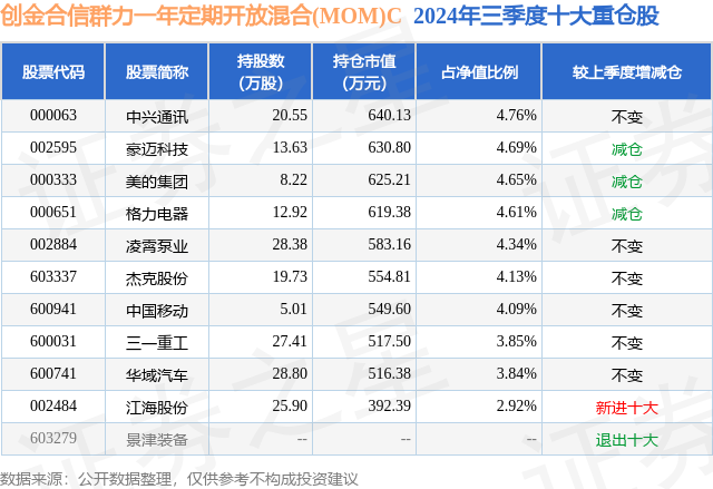 从基金规模来看,创金合信群力一年定期开放混合(MOM)C基金2024年三季度公布的基金规模为0.17亿元,较上一期规模1504.69万元变化了155.13万元,环比变化了10.31%。该基金最新一期资产配置为:股票占净值比82.36%,无债券类资产,现金占净值比18.36%。从基金持仓来看,该基金当季前十大股票仓位达41.88%,第一大重仓股为中兴通讯(000063),持仓占比为4.76%。