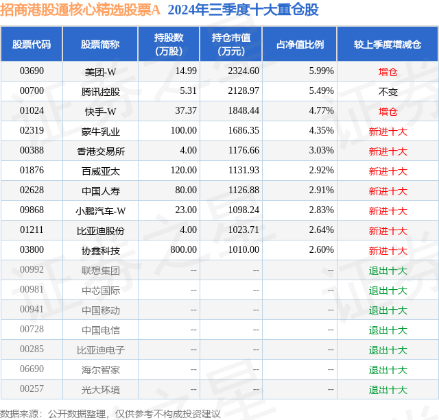 从基金规模来看,招商港股通核心精选股票A基金2024年三季度公布的基金规模为3.48亿元,较上一期规模2.62亿元变化了8551.05万元,环比变化了32.6%。该基金最新一期资产配置为:股票占净值比93.51%,无债券类资产,现金占净值比10.61%。从基金持仓来看,该基金当季前十大股票仓位达37.53%,第一大重仓股为美团-W(03690),持仓占比为5.99%。