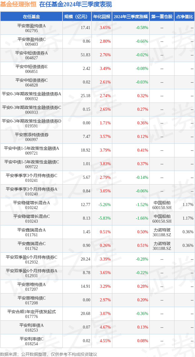 从基金规模来看,平安鑫瑞混合A基金2024年三季度公布的基金规模为1.45亿元,较上一期规模1.82亿元变化了-3644.86万元,环比变化了-20.03%。该基金最新一期资产配置为:股票占净值比5.38%,债券占净值比110.28%,现金占净值比1.57%。从基金持仓来看,该基金当季前十大股票仓位达2.6%,第一大重仓股为力诺特玻(301188),持仓占比为0.36%。