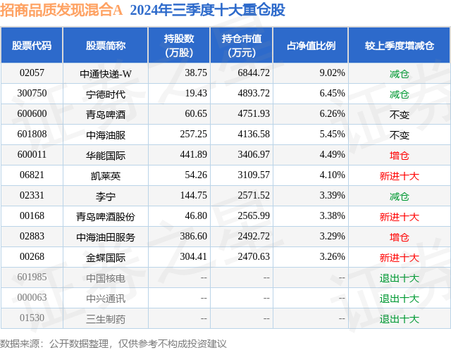 从基金规模来看,招商品质发现混合A基金2024年三季度公布的基金规模为6.16亿元,较上一期规模5.11亿元变化了1.05亿元,环比变化了20.59%。该基金最新一期资产配置为:股票占净值比93.66%,债券占净值比4.11%,现金占净值比1.81%。从基金持仓来看,该基金当季前十大股票仓位达49.09%,第一大重仓股为中通快递-W(02057),持仓占比为9.02%。
