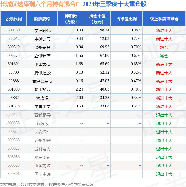 从基金规模来看,长城优选添瑞六个月持有混合C基金2024年三季度公布的基金规模为0.0亿元,较上一期规模6.94万元变化了0.14万元,环比变化了2.05%。该基金最新一期资产配置为:股票占净值比16.08%,债券占净值比56.61%,现金占净值比0.6%。从基金持仓来看,该基金当季前十大股票仓位达5.79%,第一大重仓股为宁德时代(300750),持仓占比为0.98%。