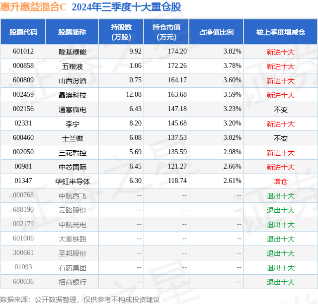 从基金规模来看,惠升惠益混合C基金2024年三季度公布的基金规模为0.17亿元,较上一期规模2196.67万元变化了-449.0万元,环比变化了-20.44%。该基金最新一期资产配置为:股票占净值比38.53%,债券占净值比59.41%,现金占净值比4.69%。从基金持仓来看,该基金当季前十大股票仓位达32.49%,第一大重仓股为隆基绿能(601012),持仓占比为3.82%。