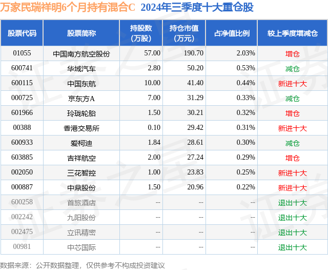 从基金规模来看,万家民瑞祥明6个月持有混合C基金2024年三季度公布的基金规模为0.07亿元,较上一期规模739.75万元变化了-44.0万元,环比变化了-5.95%。该基金最新一期资产配置为:股票占净值比8.18%,债券占净值比48.32%,现金占净值比6.42%。从基金持仓来看,该基金当季前十大股票仓位达5.02%,第一大重仓股为中国南方航空股份(01055),持仓占比为2.03%。