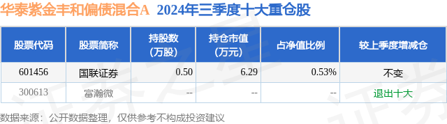 从基金规模来看,华泰紫金丰和偏债混合A基金2024年三季度公布的基金规模为0.11亿元,较上一期规模1114.04万元变化了-7.56万元,环比变化了-0.68%。该基金最新一期资产配置为:股票占净值比0.53%,债券占净值比31.31%,现金占净值比22.19%。从基金持仓来看,该基金当季前十大股票仓位达0.53%,第一大重仓股为国联证券(601456),持仓占比为0.53%。