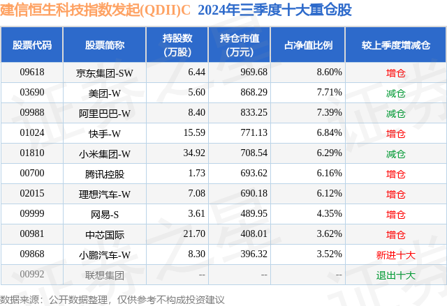 从基金规模来看,建信恒生科技指数发起(QDII)C基金2024年三季度公布的基金规模为0.66亿元,较上一期规模4618.37万元变化了1979.51万元,环比变化了42.86%。该基金最新一期资产配置为:股票占净值比90.81%,无债券类资产,现金占净值比16.85%。从基金持仓来看,该基金当季前十大股票仓位达60.6%,第一大重仓股为京东集团-SW(09618),持仓占比为8.6%。