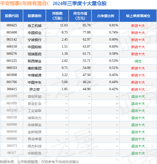 从基金规模来看,平安恒泰1年持有混合C基金2024年三季度公布的基金规模为0.13亿元,较上一期规模1526.99万元变化了-226.39万元,环比变化了-14.83%。该基金最新一期资产配置为:股票占净值比11.45%,债券占净值比106.06%,现金占净值比2.67%。从基金持仓来看,该基金当季前十大股票仓位达5.68%,第一大重仓股为徐工机械(000425),持仓占比为0.81%。