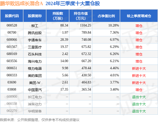从基金规模来看,鹏华致远成长混合A基金2024年三季度公布的基金规模为1.03亿元,较上一期规模9955.99万元变化了361.59万元,环比变化了3.63%。该基金最新一期资产配置为:股票占净值比89.0%,无债券类资产,现金占净值比11.16%。从基金持仓来看,该基金当季前十大股票仓位达59.01%,第一大重仓股为柳工(000528),持仓占比为10.28%。