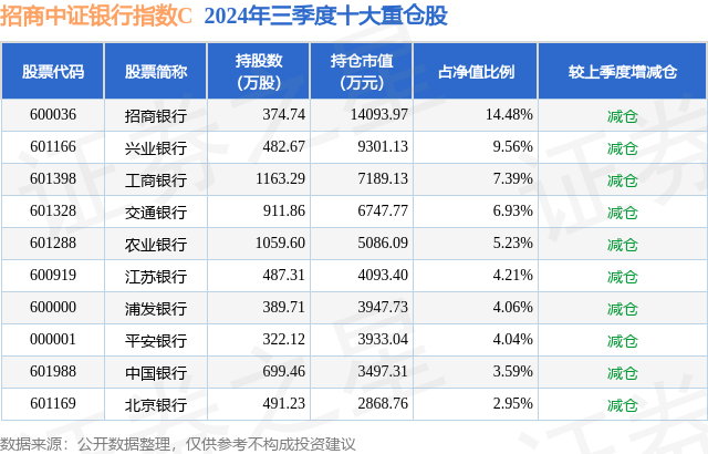 从基金规模来看,招商中证银行指数C基金2024年三季度公布的基金规模为0.44亿元,较上一期规模4729.02万元变化了-344.1万元,环比变化了-7.28%。该基金最新一期资产配置为:股票占净值比94.89%,债券占净值比0.07%,现金占净值比4.97%。从基金持仓来看,该基金当季前十大股票仓位达62.44%,第一大重仓股为招商银行(600036),持仓占比为14.48%。
