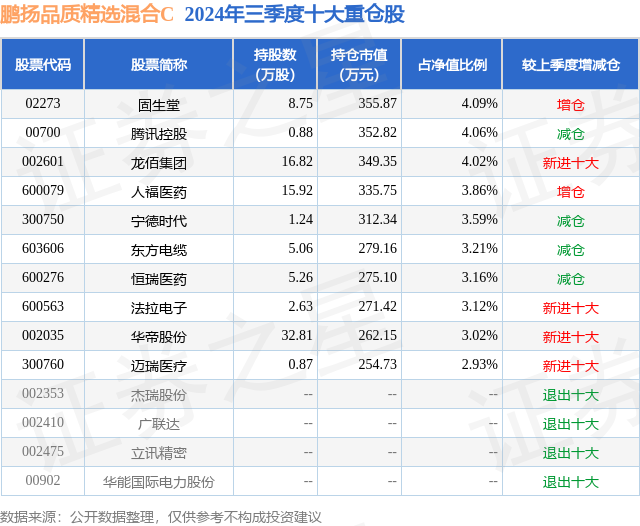 从基金规模来看,鹏扬品质精选混合C基金2024年三季度公布的基金规模为0.15亿元,较上一期规模1435.4万元变化了85.69万元,环比变化了5.97%。该基金最新一期资产配置为:股票占净值比91.24%,债券占净值比5.48%,现金占净值比5.31%。从基金持仓来看,该基金当季前十大股票仓位达35.06%,第一大重仓股为固生堂(02273),持仓占比为4.09%。