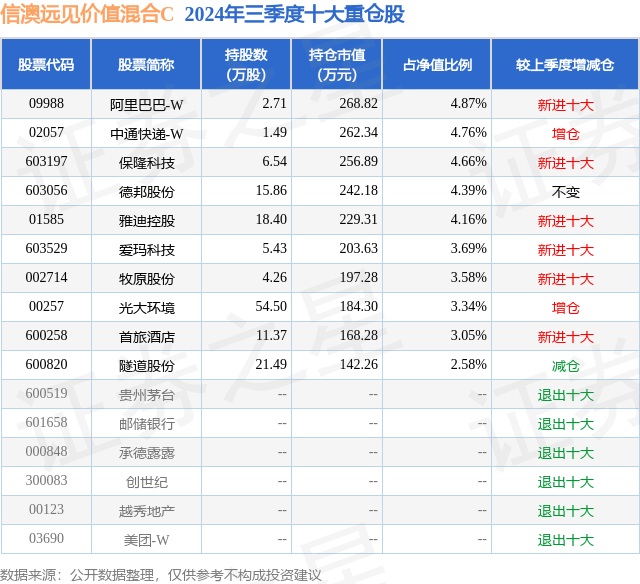 从基金规模来看,信澳远见价值混合C基金2024年三季度公布的基金规模为0.17亿元,较上一期规模1585.67万元变化了91.09万元,环比变化了5.74%。该基金最新一期资产配置为:股票占净值比83.99%,债券占净值比0.34%,现金占净值比18.09%。从基金持仓来看,该基金当季前十大股票仓位达39.08%,第一大重仓股为阿里巴巴-W(09988),持仓占比为4.87%。