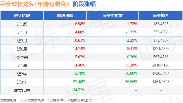 从业绩表现来看,平安成长龙头1年持有混合A基金过去一年净值涨幅为-10.22%,在同类基金中排名3725/3979,同类基金过去一年净值涨幅中位数为5.4%。而基金过去一年的最大回撤为-30.32%,成立以来的最大回撤为-50.85%。