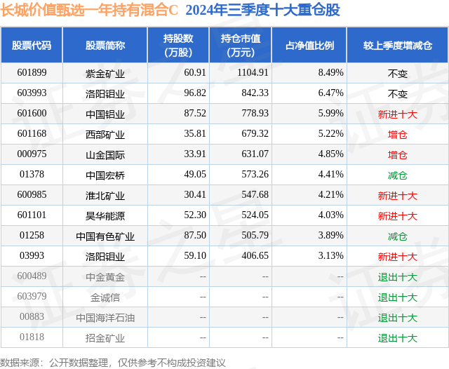 从基金规模来看,长城价值甄选一年持有混合C基金2024年三季度公布的基金规模为0.14亿元,较上一期规模1439.4万元变化了10.46万元,环比变化了0.73%。该基金最新一期资产配置为:股票占净值比87.32%,无债券类资产,现金占净值比11.64%。从基金持仓来看,该基金当季前十大股票仓位达50.69%,第一大重仓股为紫金矿业(601899),持仓占比为8.49%。