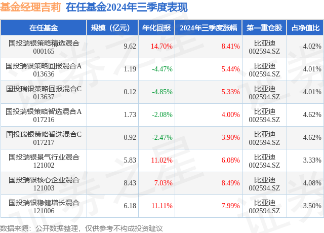 从基金规模来看,国投瑞银策略回报混合C基金2024年三季度公布的基金规模为0.12亿元,较上一期规模1132.51万元变化了31.01万元,环比变化了2.74%。该基金最新一期资产配置为:股票占净值比88.91%,无债券类资产,现金占净值比11.43%。从基金持仓来看,该基金当季前十大股票仓位达26.72%,第一大重仓股为比亚迪(002594),持仓占比为4.01%。