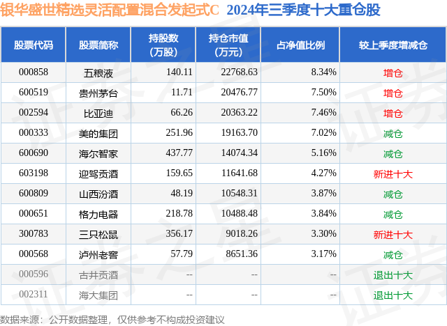 从基金规模来看,银华盛世精选灵活配置混合发起式C基金2024年三季度公布的基金规模为0.11亿元,较上一期规模408.47万元变化了647.6万元,环比变化了158.54%。该基金最新一期资产配置为:股票占净值比93.32%,无债券类资产,现金占净值比8.2%。从基金持仓来看,该基金当季前十大股票仓位达53.93%,第一大重仓股为五粮液(000858),持仓占比为8.34%。