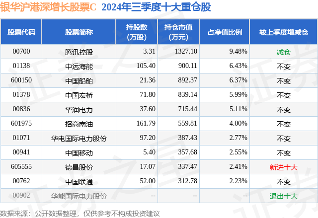 从基金规模来看,银华沪港深增长股票C基金2024年三季度公布的基金规模为0.0亿元,较上一期规模27.04万元变化了9.25万元,环比变化了34.2%。该基金最新一期资产配置为:股票占净值比86.21%,无债券类资产,现金占净值比13.86%。从基金持仓来看,该基金当季前十大股票仓位达47.34%,第一大重仓股为腾讯控股(00700),持仓占比为9.48%。