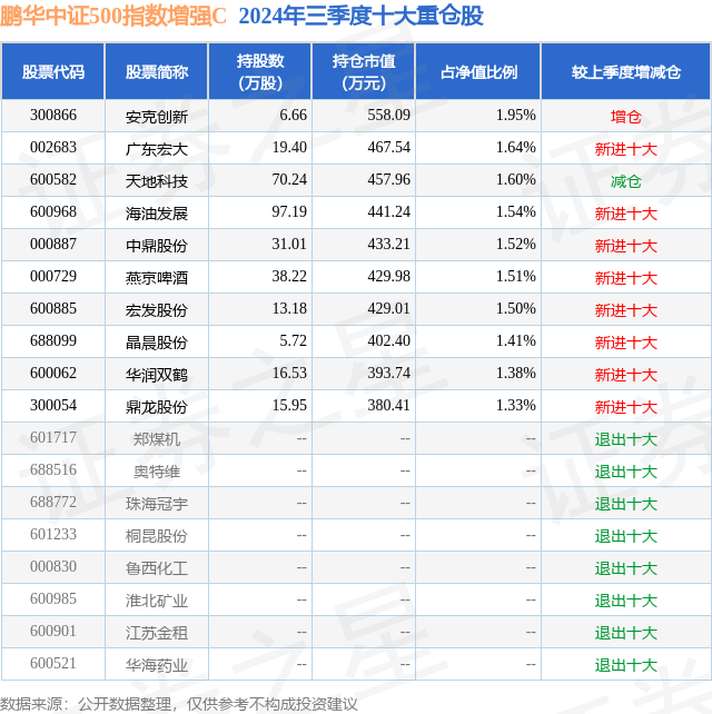 从基金规模来看,鹏华中证500指数增强C基金2024年三季度公布的基金规模为1.41亿元,较上一期规模1.66亿元变化了-2511.01万元,环比变化了-15.16%。该基金最新一期资产配置为:股票占净值比93.3%,无债券类资产,现金占净值比14.09%。从基金持仓来看,该基金当季前十大股票仓位达15.38%,第一大重仓股为安克创新(300866),持仓占比为1.95%。