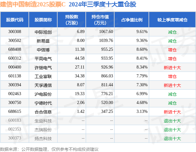 从基金规模来看,建信中国制造2025股票C基金2024年三季度公布的基金规模为0.05亿元,较上一期规模429.78万元变化了79.35万元,环比变化了18.46%。该基金最新一期资产配置为:股票占净值比82.21%,无债券类资产,现金占净值比17.16%。从基金持仓来看,该基金当季前十大股票仓位达74.21%,第一大重仓股为中际旭创(300308),持仓占比为9.61%。