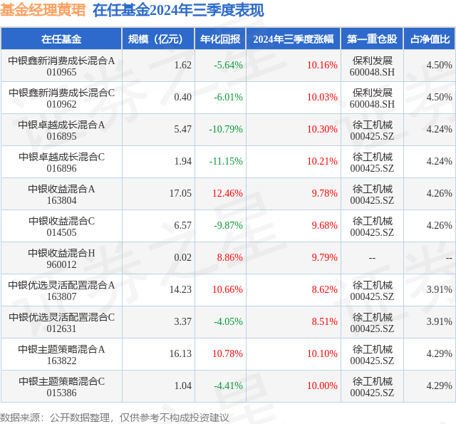中银收益混合C现任基金经理为黄珺。其中在任基金经理黄珺已从业5年又229天,2021年12月29日正式接手管理中银收益混合C,任职期间累计回报为-25.45%。目前还管理着11只基金产品(包括A类和C类),其中本季度表现最佳的基金为中银卓越成长混合A(016895),季度净值涨幅为10.3%。