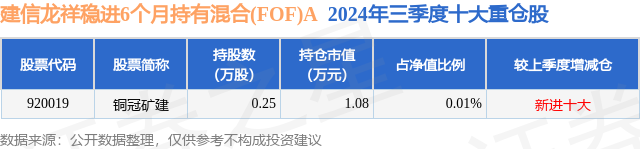 从基金规模来看,建信龙祥稳进6个月持有混合(FOF)A基金2024年三季度公布的基金规模为1.71亿元,较上一期规模1.85亿元变化了-1354.68万元,环比变化了-7.34%。该基金最新一期资产配置为:股票占净值比0.01%,债券占净值比5.5%,现金占净值比0.53%。从基金持仓来看,该基金当季前十大股票仓位达0.01%,第一大重仓股为铜冠矿建(920019),持仓占比为0.01%。