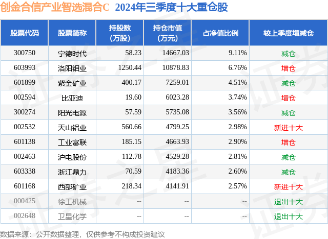 从基金规模来看,创金合信产业智选混合C基金2024年三季度公布的基金规模为1.97亿元,较上一期规模1.88亿元变化了900.73万元,环比变化了4.78%。该基金最新一期资产配置为:股票占净值比93.25%,债券占净值比3.73%,现金占净值比2.47%。从基金持仓来看,该基金当季前十大股票仓位达41.54%,第一大重仓股为宁德时代(300750),持仓占比为9.11%。