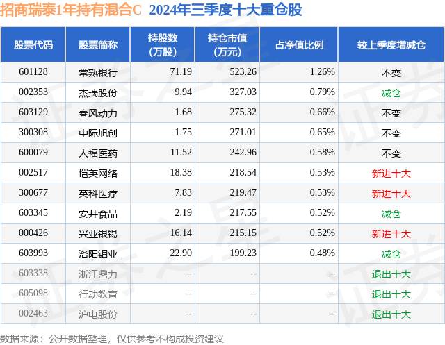 证券之星消息,日前招商瑞泰1年持有混合C基金公布三季报,2024年三季度最新规模0.22亿元,季度净值涨幅为1.18%。