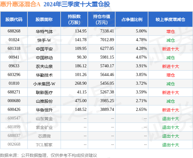 从基金规模来看,惠升惠泽混合A基金2024年三季度公布的基金规模为8.81亿元,较上一期规模10.1亿元变化了-1.29亿元,环比变化了-12.74%。该基金最新一期资产配置为:股票占净值比78.56%,无债券类资产,现金占净值比25.67%。从基金持仓来看,该基金当季前十大股票仓位达38.56%,第一大重仓股为华特气体(688268),持仓占比为5.0%。
