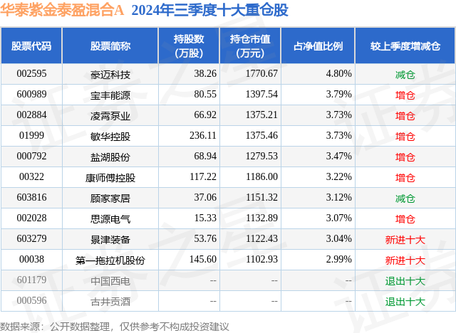 从基金规模来看,华泰紫金泰盈混合A基金2024年三季度公布的基金规模为0.45亿元,较上一期规模4125.76万元变化了334.8万元,环比变化了8.11%。该基金最新一期资产配置为:股票占净值比86.53%,债券占净值比5.4%,现金占净值比9.36%。从基金持仓来看,该基金当季前十大股票仓位达34.96%,第一大重仓股为豪迈科技(002595),持仓占比为4.8%。