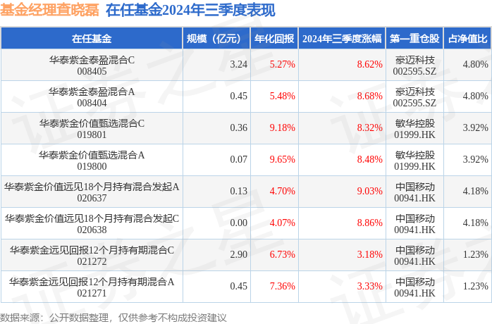 证券之星消息,日前华泰紫金泰盈混合A基金公布三季报,2024年三季度最新规模0.45亿元,季度净值涨幅为8.68%。