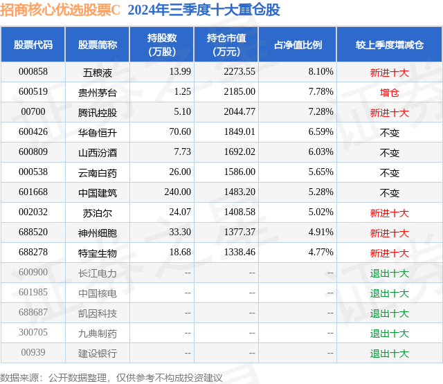 从基金规模来看,招商核心优选股票C基金2024年三季度公布的基金规模为0.24亿元,较上一期规模2241.04万元变化了183.94万元,环比变化了8.21%。该基金最新一期资产配置为:股票占净值比85.01%,无债券类资产,现金占净值比16.06%。从基金持仓来看,该基金当季前十大股票仓位达61.41%,第一大重仓股为五粮液(000858),持仓占比为8.1%。