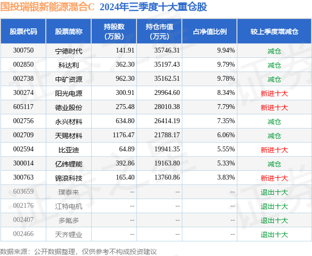 从基金规模来看,国投瑞银新能源混合C基金2024年三季度公布的基金规模为17.37亿元,较上一期规模15.94亿元变化了1.43亿元,环比变化了8.96%。该基金最新一期资产配置为:股票占净值比93.98%,无债券类资产,现金占净值比6.15%。从基金持仓来看,该基金当季前十大股票仓位达73.76%,第一大重仓股为宁德时代(300750),持仓占比为9.94%。